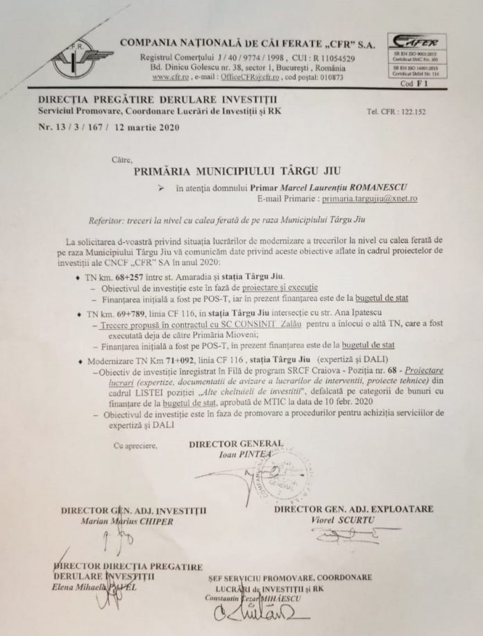 ,,Este vorba despre trecerile din strada Amaradia (zona fostei Avicola), cea din strada Ana Ipătescu și cea de pe strada Tudor Vladimirescu. În urma discuțiilor pe care le-am purtat anul trecut cu ministrul Transporturilor, Lucian Bode, dar și a numeroaselor demersuri pe care le-am făcut către societatea de transport feroviar, cele trei obiective se regăsesc în proiectele de investiții ale CNCF ,,CFR” SA în anul 2020”, a anunțat Romanescu.