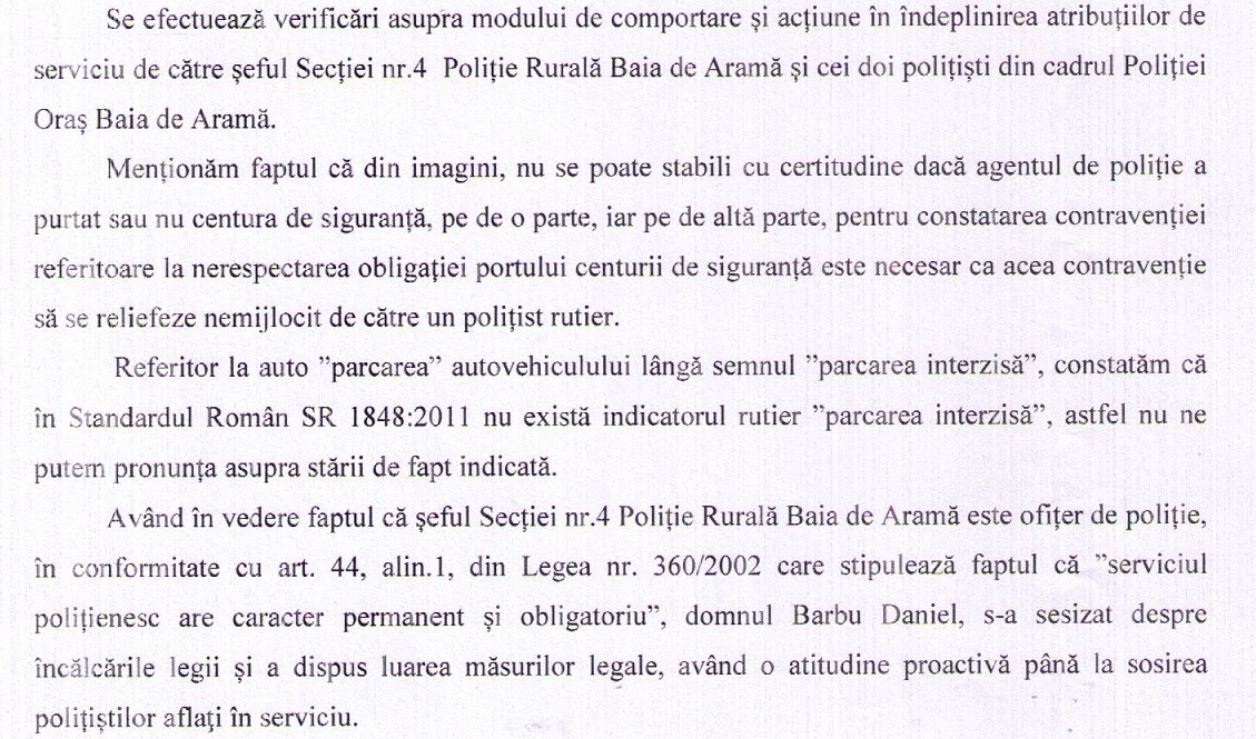 ”Menționăm faptul că din imagini nu se poate stabili cu certitudine dacă agentul de Poliție a purtat sau nu centura de siguranță, pe de o parte, iar pe de altă parte, pentru constatarea contravenției referitoare la nerespectarea obligației portului centurii de siguranță este necesar ca acea contravenție să se reliefeze în mod nemijlocit de către un polițist rutier. Se efectuează verificări asupra modului de comportare și acțiune în indeplinirea atribuțiilor de serviciu de către șeful Secției Nr. 4 Poliție Rurală Baia de Aramă și cei doi polițiști din cadrul Poliției Oraș Baia de Aramă”, se precizează într-un comunicat de presă al IPJ Mehedinți, în urma unei solicitări a reporterilor Gorjeanul. La finalul comunitului de presă, reprezentanții IPJ Mehedinți susțin însă că șeful Secției de Poliție Rurală Nr. 4 Baia de Aramă a acționat așa cum se cuvine la fața locului, după ce a fost filmat în timp ce le spune subalternilor, de pe marginea, drumului să-l încătușeze pe șofer. ”Pune-i cătușele, odată, Cătăline! Voi nu știți cum se procedează? Vă învăț eu de aici?”, a spus acesta. ”Având în vedere faptul că șeful Secției Nr. 4 Poliție Rurală Baia de Aramă este ofițer de Poliție, în conformitate cu art. 44, alin.1, din Legea nr.360/2002 care stipulează faptul că serviciul polițienesc are caracter permanent și obligatoriu, domnul Barbu Daniel s-a sesizat despre încălcările legii și a dispus luarea măsurilor legale, având o atitudine proactivă până la sosirea polițiștilor de serviciu”, a precizat MădălinA viziru, purtătorul de cuvânt al IPJ Mehedinți.