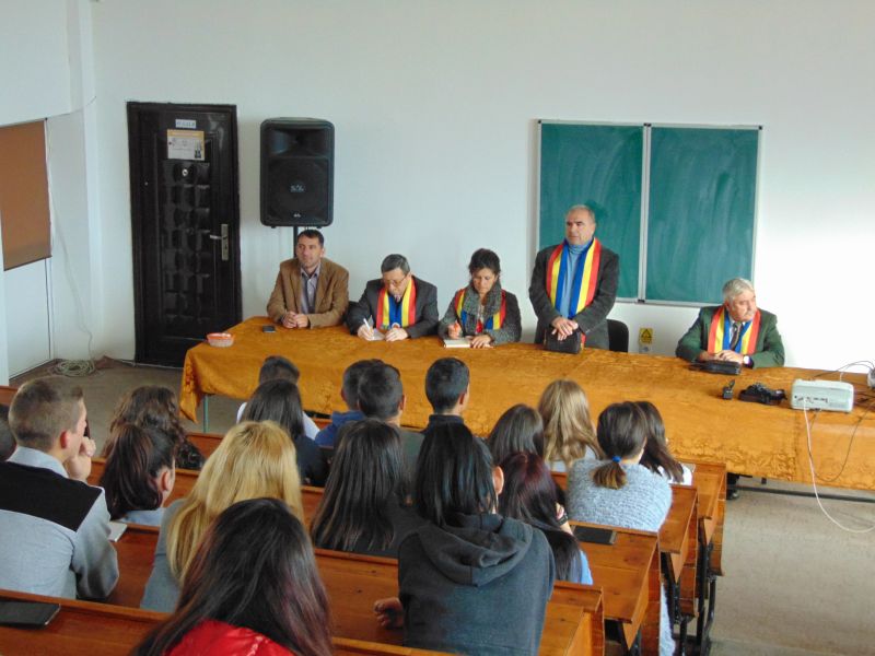 Am fost conduși în amfiteatru de către domnul Lupulescu, unde ne așteptau peste 50 de elevi. Le-a spus elevilor cine suntem și scopul prezenței noastre în mijlocul lor. A prezentat un scurt istoric al colegiului apoi a dat cuvântul domnului col. (r.) dr. ing. Walter Loga.