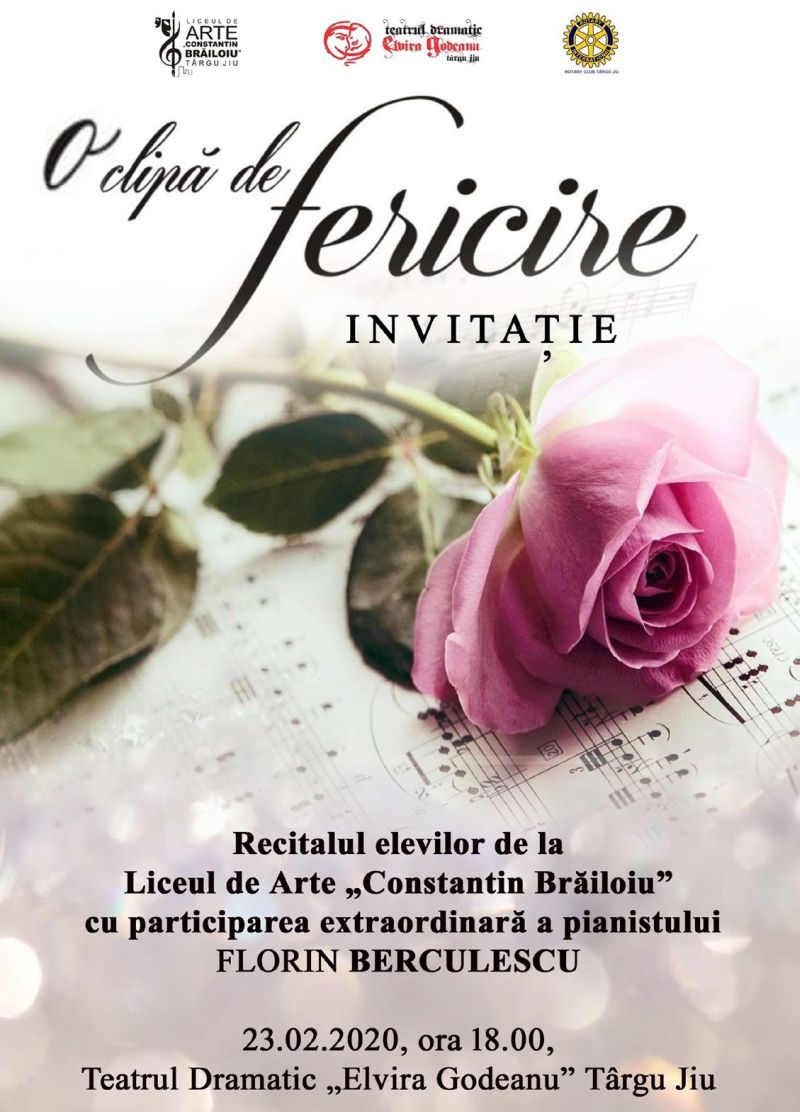 Cu prilejul aniversării a 115 ani de la fondarea Rotary Internaţional, Teatrul Dramatic „Elvira Godeanu” din Târgu- Jiu va fi gazda recitalului elevilor de la Liceul de Arte „Constantin Brăiloiu” cu participarea extraordinară a pianistului Florin Berculescu. Evenimentul va avea loc pe 23 februarie, de la ora 18.00 şi este organizat sub titulatura „O clipă de fericire”, ediţia a III-a.În 23 februarie 1905, avocatul Paul Harris împreună cu trei prieteni: Sylvester Schiele, Hiram Shorey și Gustavus Loehr au pus bazele primului club Rotary în Chicago. Ideea lui Harris a fost de a reuni cei mai buni oameni din toate domeniile și de a organiza întâlniri periodice în urma cărora să se poată bucura de camaraderia acestora și să-și lărgească cercul de cunoștiințe, care să-i ajute și în viața profesională. Aceştia au ales numele de Rotary pentru că, la început, întâlnirile săptămânale ale clubului erau găzduite pe rând de fiecare membru. După 1907 a început tradiția Rotary de a-i servi pe alții în încercarea de a îmbunătăți viețile celor mai puțin norocoși. În zilele noastre Rotary este cea mai mare organizație internațională din lume cu peste 1,2 milioane de membri organizați în peste 32.000 cluburi, în peste 200 de țări. La noi în țară primul club ia ființă la Bucureşti în 1929, din iniţiativa lui Christian Penescu-Kertsch. În anul 1936 se creează Districtul românesc, care primeşte numărul 84 și are 9 cluburi. În anul 1992, cu sprijinul rotarienilor francezi, se reînființează Clubul Rotary Bucureşti. În 1999 comitetul Rotary Internațional decide că: în România şi Republica Moldova, cluburile Rotary vor face parte din propriul lor district, numărul 2241. Clubul Rotary din Târgu-Jiu a fost înființat în 5 mai 2001.