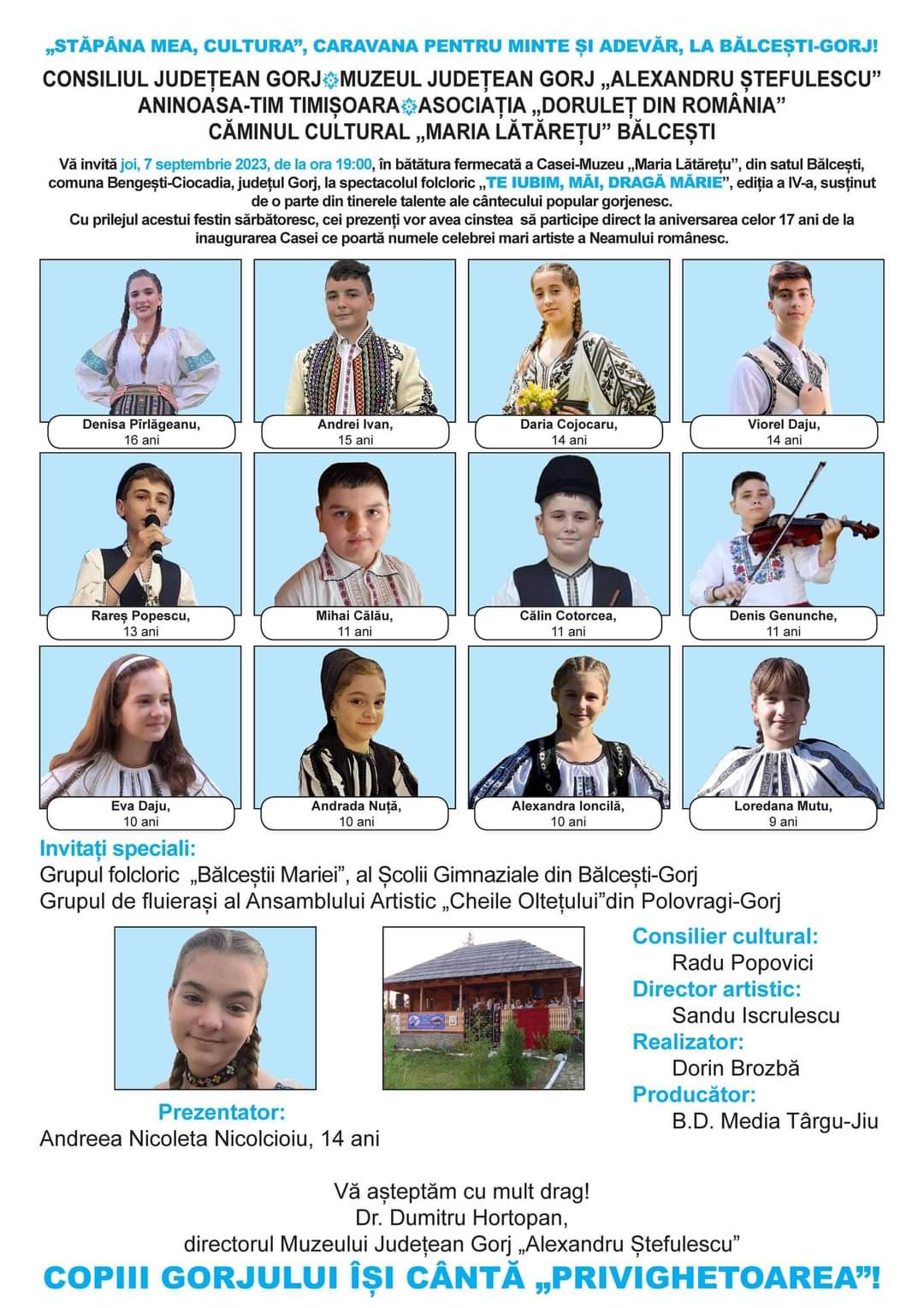 Pe 7 septembrie 2023, de la ora 19:00, la Casa-Muzeu „Maria Lătărețu” din satul Bălcești, comuna Bengești-Ciocadia, va avea loc spectacolul folcloric intitulat „Te iubim, măi, dragă Mărie”, ediția a IV-a, susținut de o parte din tinerele talente ale cânteculuu popular gorjenesc. Cu prilejul acestui eveniment, cei prezenți vor participa și la aniversarea a 17 ani de la inaugurarea casei ce poartă numele Mariei Lătărețu.