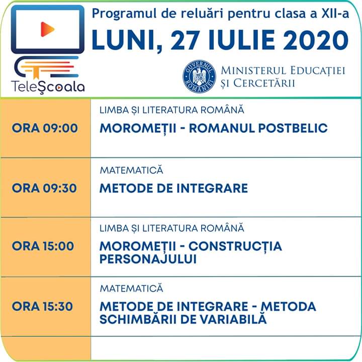De luni, 27 iulie 2020, reîncepe Teleșcoala, cu sesiuni de pregătire online pentru cei care vor susține probele de Bacalaureat luna viitoare, a anunțat Televiziunea Română. Sunt programate câte 4 lecții pe zi, iar fiecare disciplină are rezervate câte 30 de minute. Cursurile online vor fi difuzate în intervalul orar 9.00-9.30 și 15.00-15.30.
