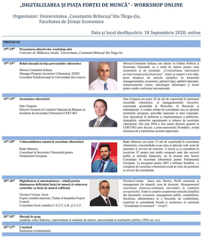 Mâine, 18 septembrie, Facultatea de Științe Economice din cadrul Universității ,,Constantin Brâncuși” din Târgu-Jiu va organiza workshop-ul online intitulat ,,Digitalizarea și piața forței de muncă”. Evenimentul va începe la ora 19:00 și se va derula timp de două ore pe canalul Webex. Moderatorul dezbaterii va fi dna. conf. univ. dr. Aniela Bălăcescu.