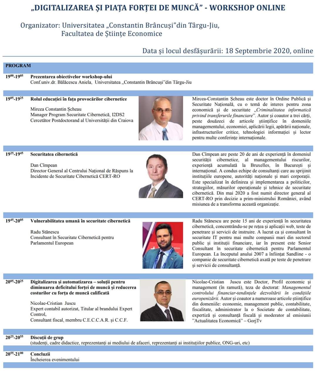 Deja, nume importante din domeniu au confirmat participarea la evenimentul online. Mircea Constantin Șcheau – Manager Program Securitate Cibernetică I2DS2, Dan Cîmpean, Director General Centrului de Răspuns la Incidente de Securitate Cibernetică CERT-RO, Radu Stănescu – Consultant Securitate Cibernetică pentru Parlamentul European și Nicolae Cristian Juscu – Expert contabil autorizat, titular al brandului Expert Control, se numără printre invitați. Cei interesați se pot înscrie online la adresa conferinta.ecostudent@gmail.com până la data de 18 septembrie, ora 12.00.
