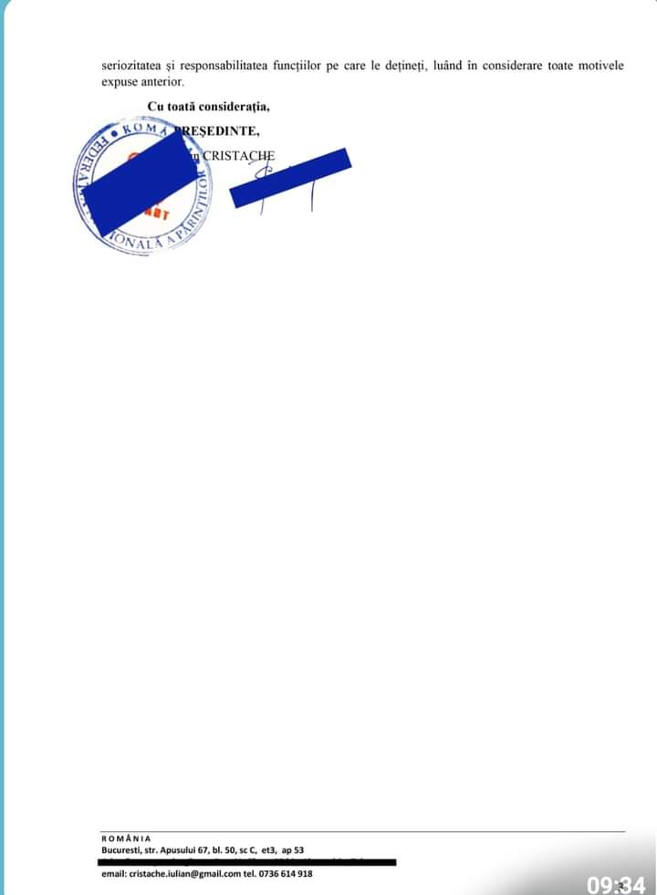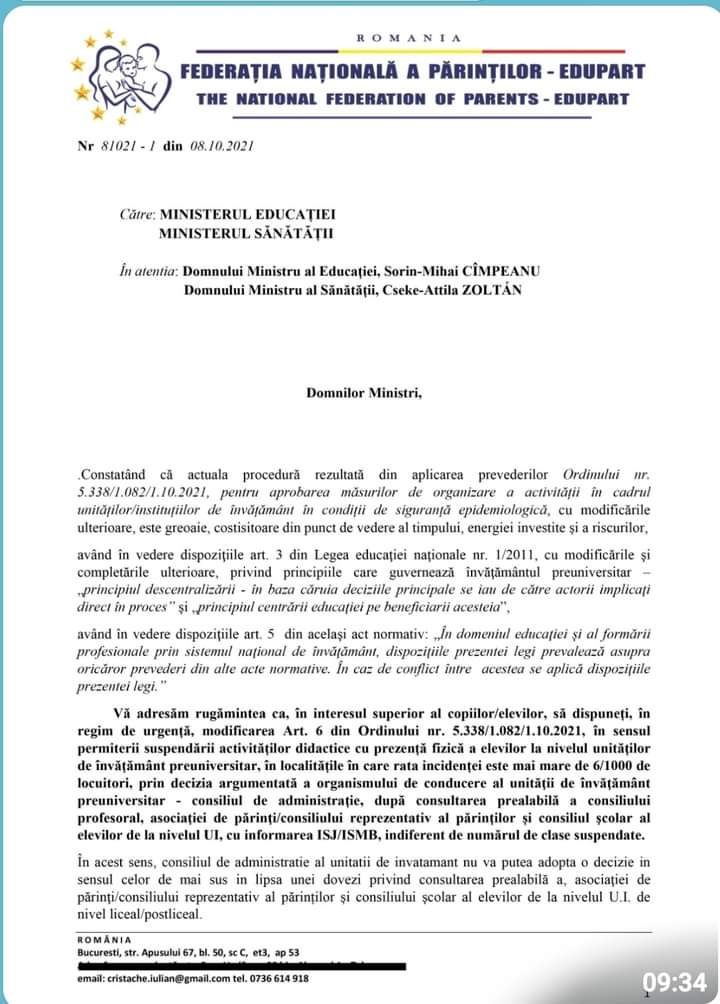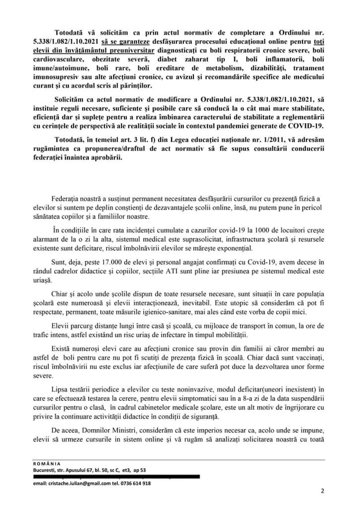 „Vă adresăm rugămintea ca, în interesul superior al copiilor/elevilor, să dispuneți, în regim de urgenţă, modificarea Art. 6 din Ordinului nr. 5.338/1.082/1.10.2021, în sensul permiterii suspendării activităților didactice cu prezență fizică a elevilor la nivelul unităţilor de învățământ preuniversitar, în localitățile în care rata incidenței este mai mare de 6/1000 de locuitori, prin decizia argumentată a organismului de conducere al unității de învăţământ preuniversitar – consiliul de administrație, după consultarea prealabilă a consiliului profesoral, asociației de părinți/consiliului reprezentativ al părinților şi consiliul școlar al elevilor de la nivelul UI, cu informarea ISJ/ISMB, indiferent de numărul de clase suspendate. În acest sens, consiliul de administratie al unității de învățământ nu va putea adopta o decizie în sensul celor de mai sus în lipsa unei dovezi privind consultarea prealabilă a asociației de părinți/consiliului reprezentativ al părinților şi consiliului şcolar al elevilor de la nivelul U.I. de la nivel liceal/postliceal. Totodată, vă solicităm ca prin actul normativ de completare a Ordinului nr. 5.338/1.082/1.10.2021 să se garanteze desfăşurarea procesului educațional online pentru toți elevii din învătământul preuniversitar diagnosticați cu boli respiratorii cronice severe, boli cardiovasculare, obezitate severă, diabet zaharat tip 1, boli inflamatorii, boli imune/autoimune, boli rare, boli ereditare de metabolism, dizabilități, tratament imunosupresiv sau alte afecţiuni cronice, cu avizul și recomandările specifice ale medicului curant şi cu acordul scris al părinţilor. Solicităm ca actul normativ de modificare a Ordinului nr. 5.338/1.082/1.10.2021 să instituie reguli necesare, suficiente şi posibile care să conducă la o cât mai mare stabilitate, eficiență, dar şi suplețe pentru a realiza îmbinarea caracterului de stabilitate a reglementării cu cerintele de perspectivă ale realității sociale în contextul pandemiei generate de COVID-19. Totodată, în temeiul art. 3 lit. f) din Legea educației naționale nr. 1/2011, vă adresăm rugămintea ca propunerea/draftul de act normativ să fie supus consultării conducerii federației înaintea aprobării”, se arată într-o adresă trimisă Ministerului Educației și Ministerului Sănătății.