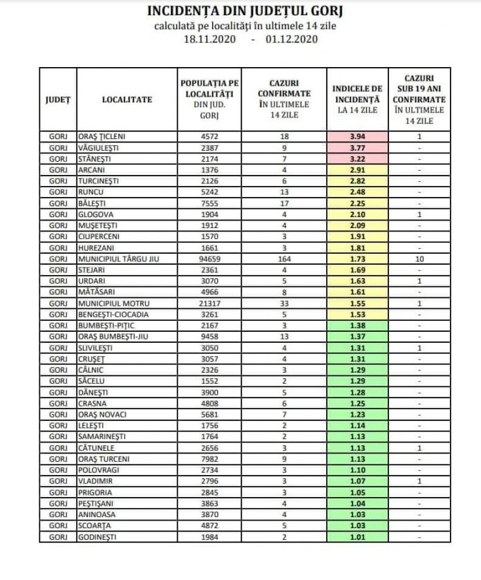 „Din această noapte se ridică restricțiile impuse de Comitetul Județean pentru Situații de Urgență la Târgu Jiu! Indicele de incidență la nivelul municipiului este de 1,73 și părăsim scenariul roșu. Vreau să vă mulțumesc, în primul rând dumneavoastră, cetățenilor, pentru responsabilitatea de care ați dat dovadă în această perioadă. În timp ce multe municipii se confruntă cu situații dificile, ajungându-se la carantină, la noi numărul de infectări este în scădere. Începem sărbătorile de iarnă cu aceasta veste bună și sper că vom continua tendința de scădere și în perioada următoare. Rămânem, totuși, rezervați, dar ne bucuram pentru faptul că multe firme își vor relua activitatea. Este o veste extraordinară pentru noi toți!”, a anunțat Marcel Romanescu, primarul municipiului Târgu Jiu.