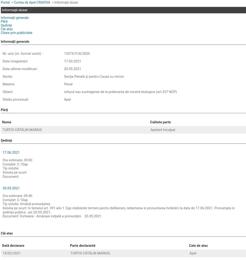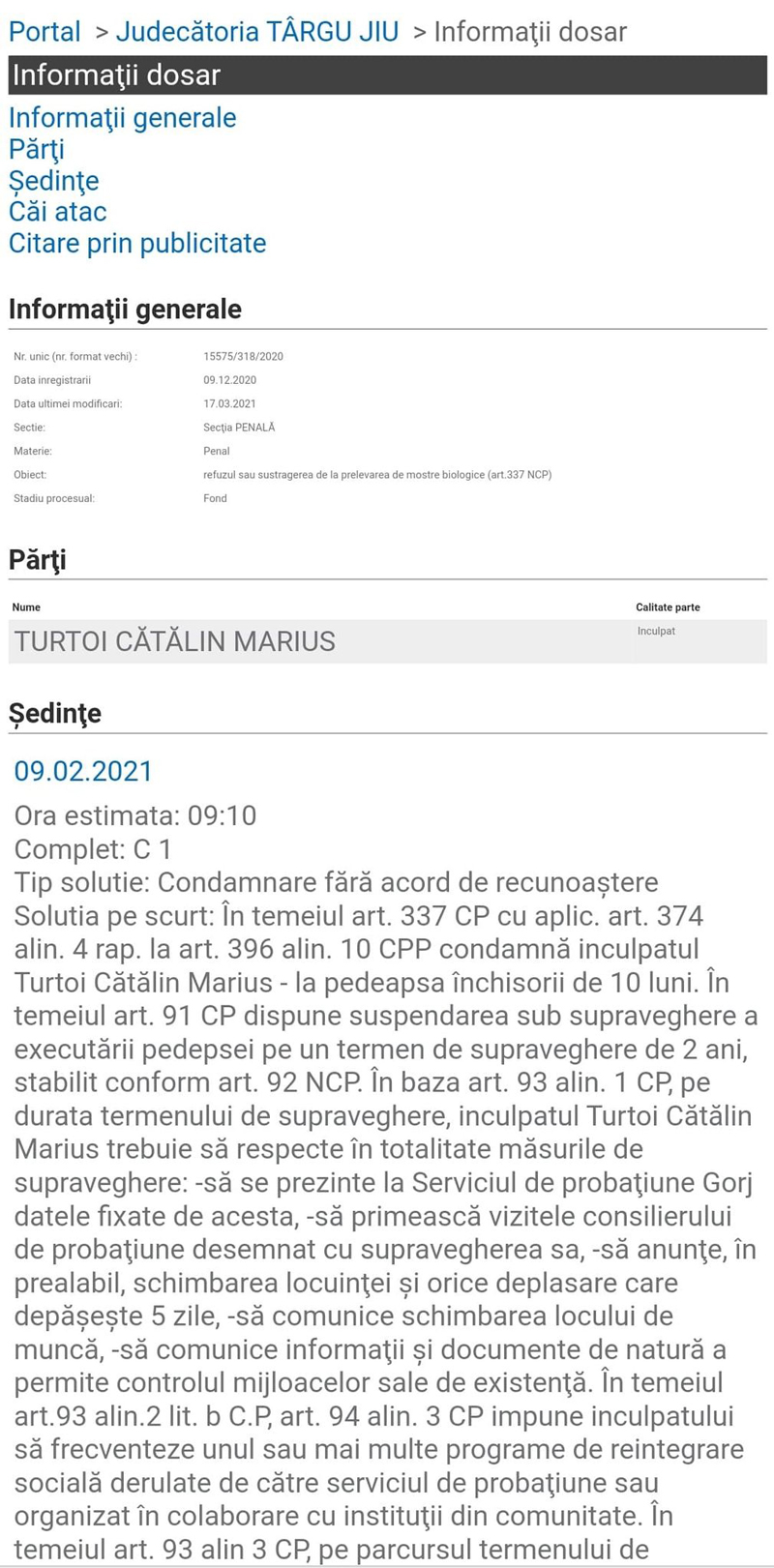 Turtoi Marius Cătălin, șef de tură la secția Chimică a SE Rovinari, a fost condamnat, în februarie, la zece luni de închisoare cu suspendare și doi ani de încercare, pentru refuz de prelevare a probelor biologice. Acesta a fost prins băut la volan, în fața Muzeului Județean Gorj, iar șoferul a refuzat să îndeplinească procedura cerută de polițiști. Faptă s-a petrecut în 2019, în Târgu Jiu, dar autorul nu era la prima abatere. În 2008, beat mangă, s-a luat în gură cu polițiștii, dar a scăpat basma curată, chiar dacă a petrecut o noapte în arest, tot pentru un eveniment rutier. S-a ales cu permisul anulat pentru zece ani, în ciuda accidentului grav petrecut în zona Gării din Târgu Jiu. În mod incredibil, comportamentul acestuia abuziv la locul de muncă și condamnarea pe fond, ultimul dosar aflându-se pe rolul Curții de Apel Craiova, îl scapă însă acum și de restructurarea operată în companie. Într-un cuvânt, oamenii competenți pleacă, dar Turtoi rămâne.