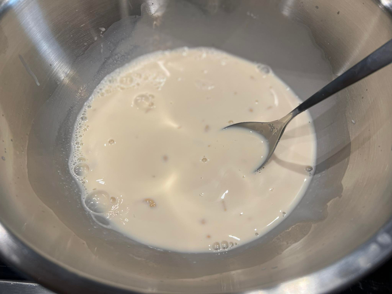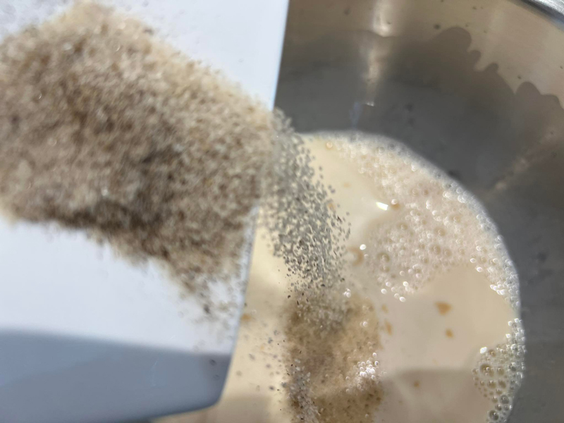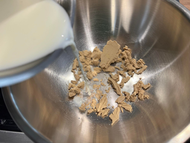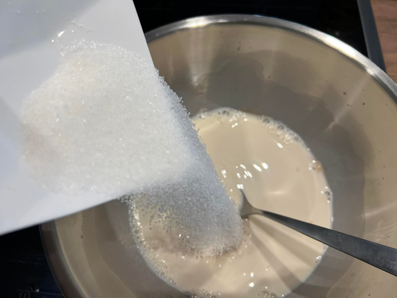 Turnăm laptele, zahărul și amestecăm totul bine până când drojdia s-a dizolvat în lapte.