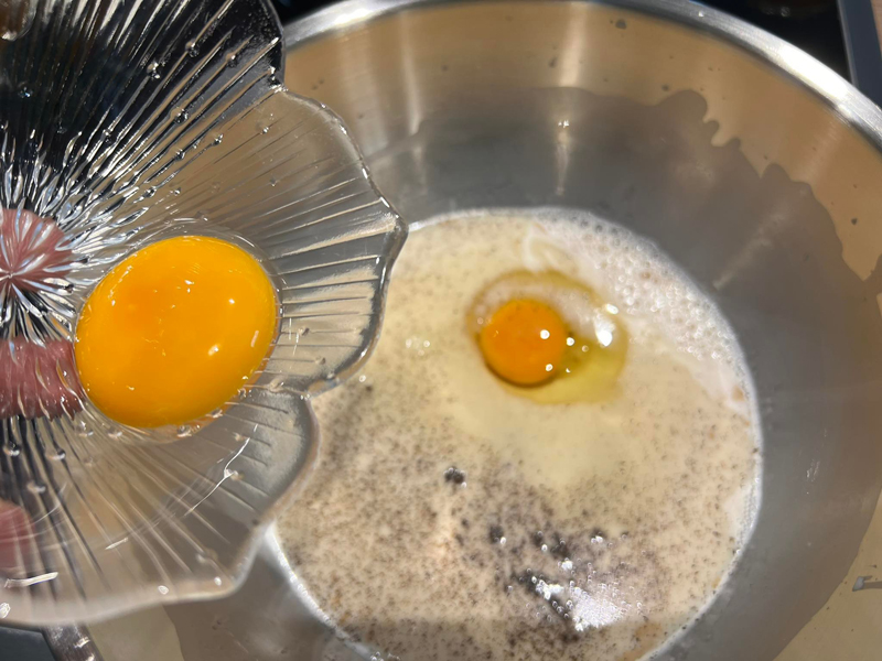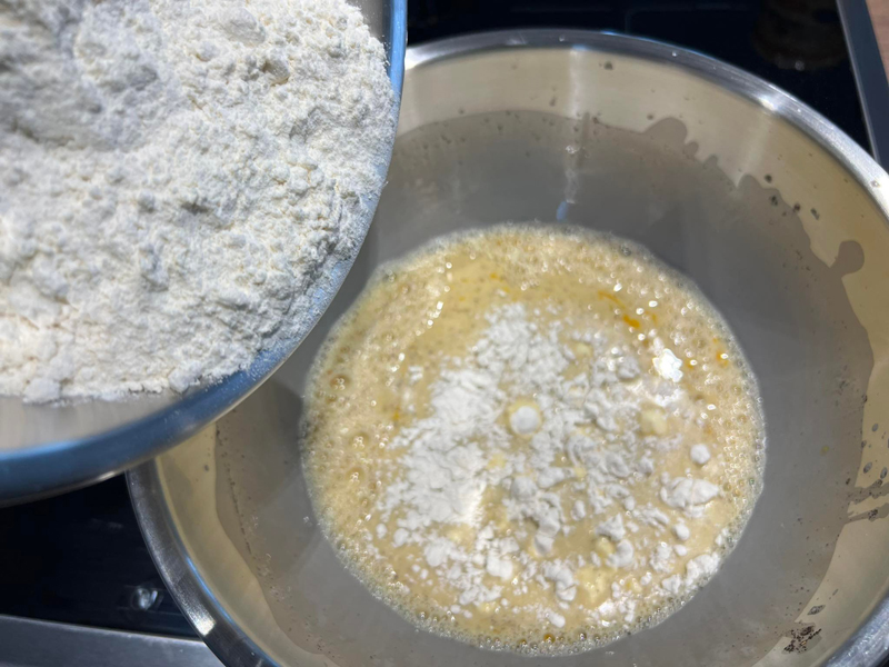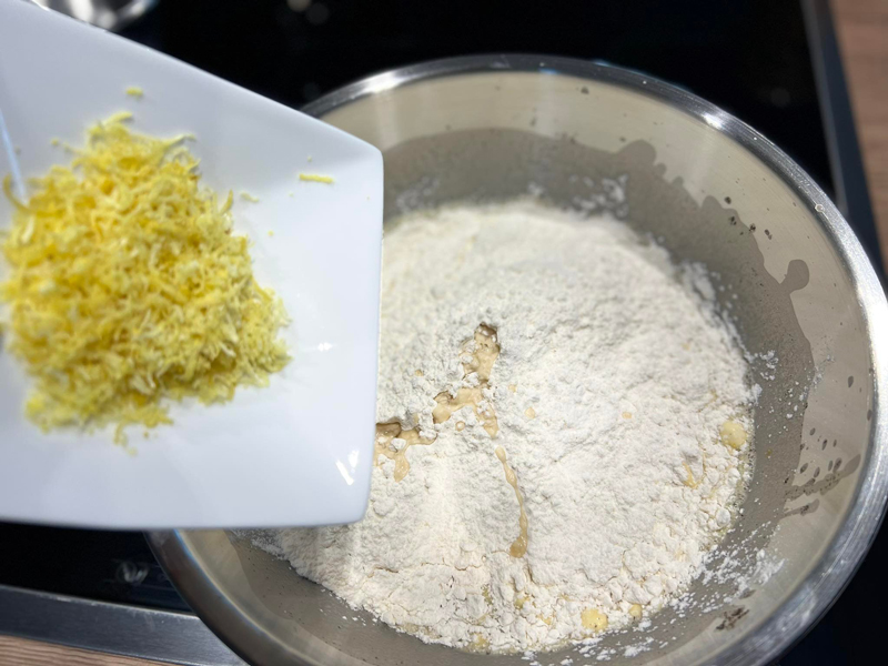 Apoi, adăugăm ouăle, sarea, zahărul vanilat și amestecam bine. Turnăm făina, coaja