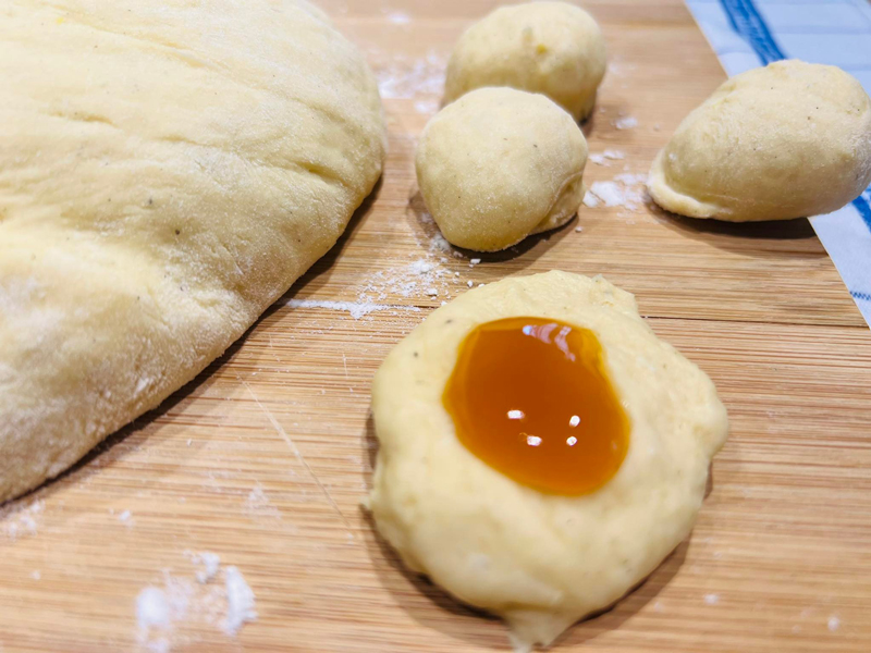 puțin cu mâna și le aducem la forma de chiftele. Adăugăm în mijloc, cu o linguriță, dulceața