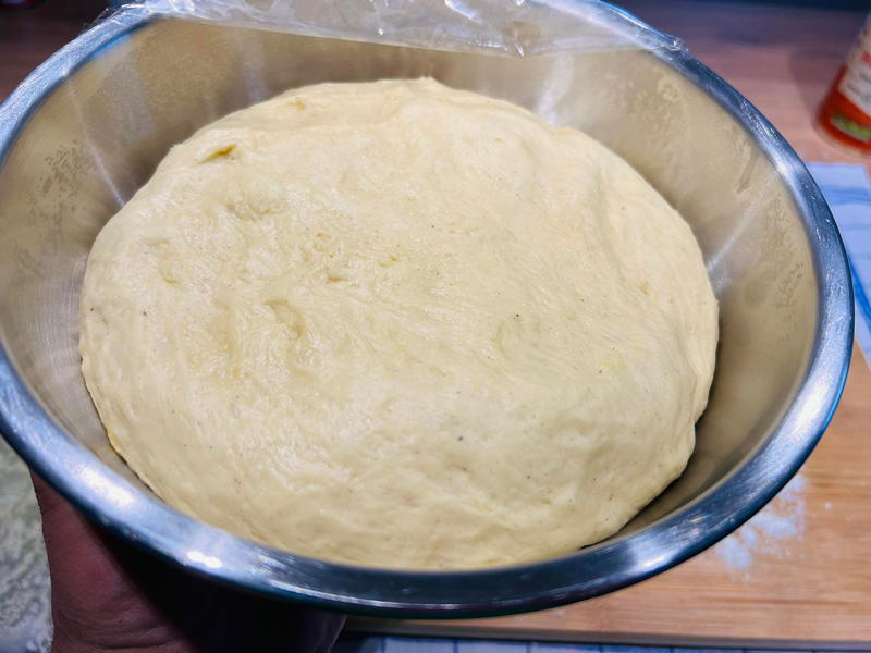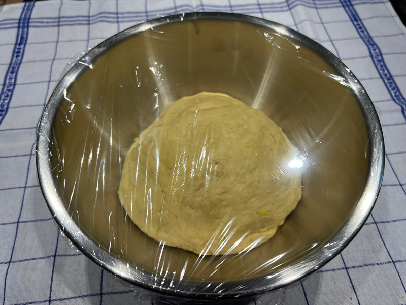 Presarăm apoi puțină făină într-un bol și mutăm aluatul. Acoperim bolul cu o folie de plastic care să acopere și să izoleze foarte bine aluatul pentru că are nevoie de umiditate, deci nu