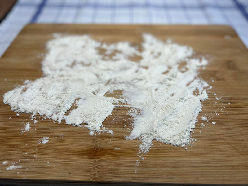 pentru pregătirea plăcintelor. Presarăm apoi făina peste un blat de lucru și adăugăm