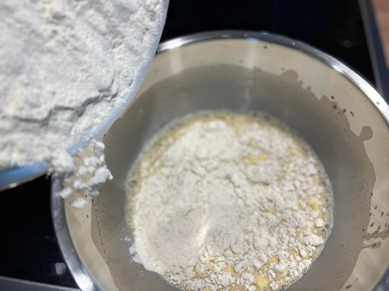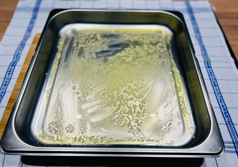 Încălzim restul de unt până devine lichid. Îl adăugăm într-o tavă înaltă, este important