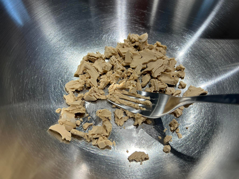 Adăugăm drojdia într-un bol și o sfărâmăm bine cu o furculiță.