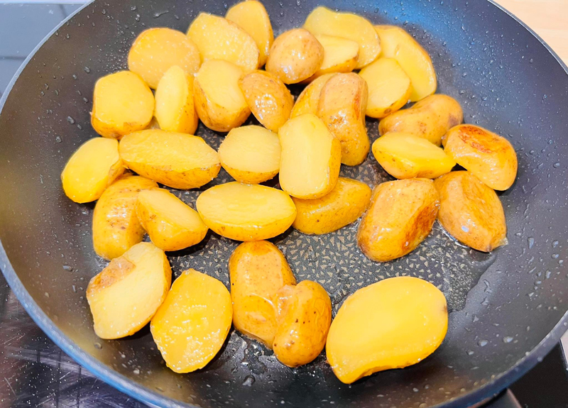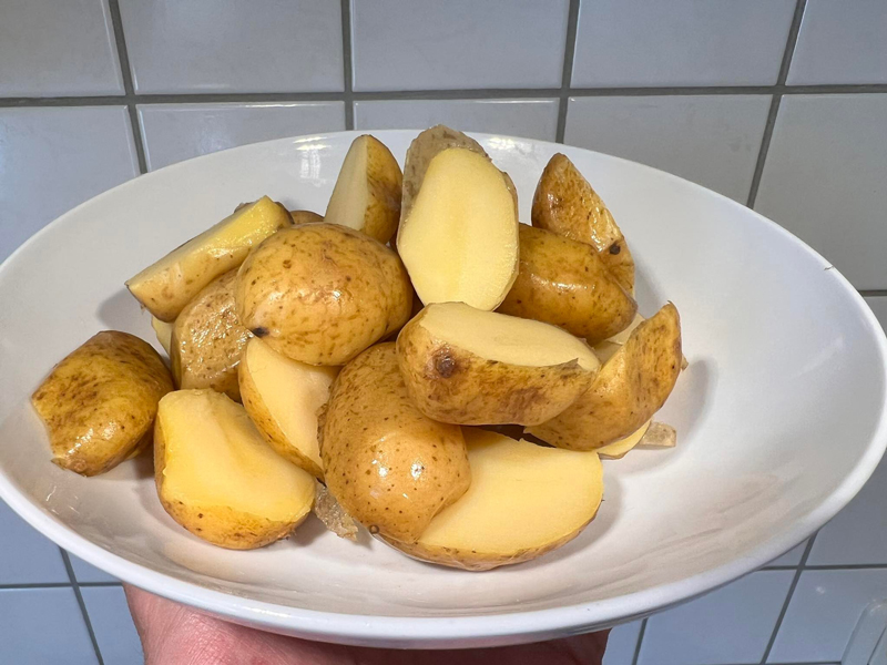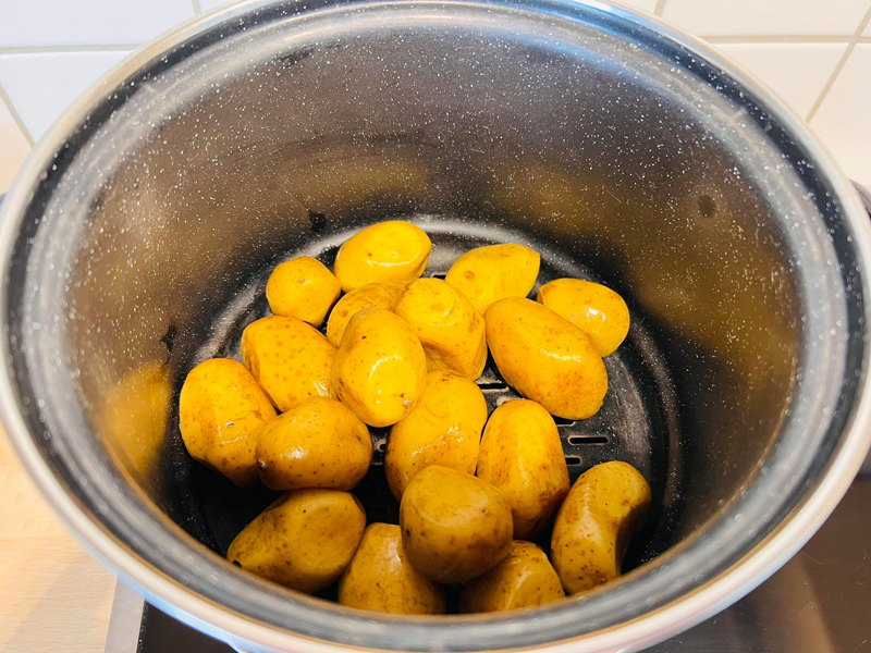Spălam bine cartofii și, într-o oală pe abur, îi punem la fiert în coaja lor. După ce s-au fiert cartofii îi lăsăm la răcit apoi îi tăiem pe jumătate. Până se răcesc cartofii, putem să profităm de timp și să ne apucăm de cordon blue.