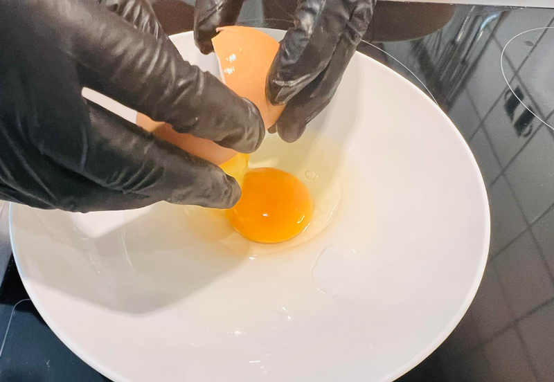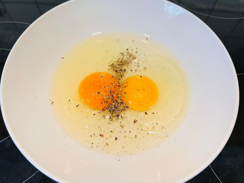 Batem două ouă peste care adăugăm sare și piper, după gust și amestecăm totul bine. Eu, la șnițele sau cordon blue nu condimentez carnea, prefer să adaug condimentele în amestecul de ouă.