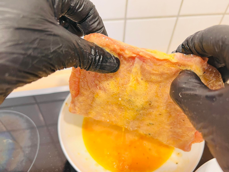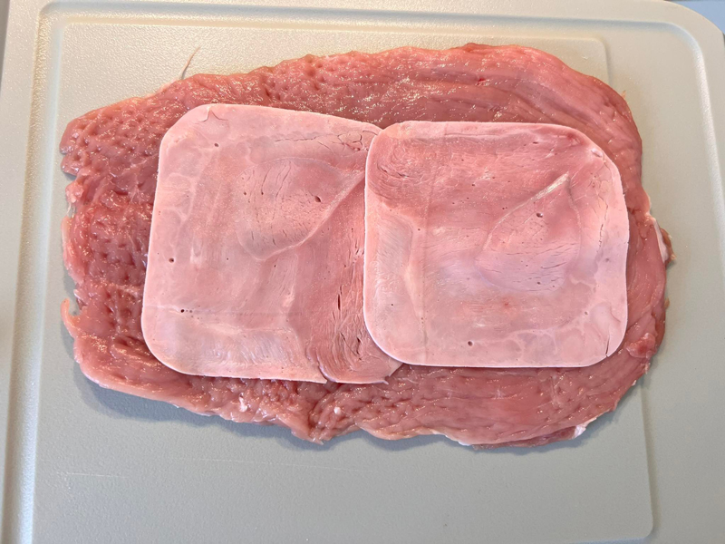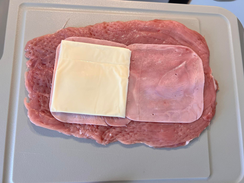 Întindem feliile de carne și peste acestea adăugăm două felii de șuncă toast și o bucată de cașcaval sau brânză toast. Împăturim carnea și batem marginile ușor cu ciocanul, în acest mod sigilăm umplutura în interior.
