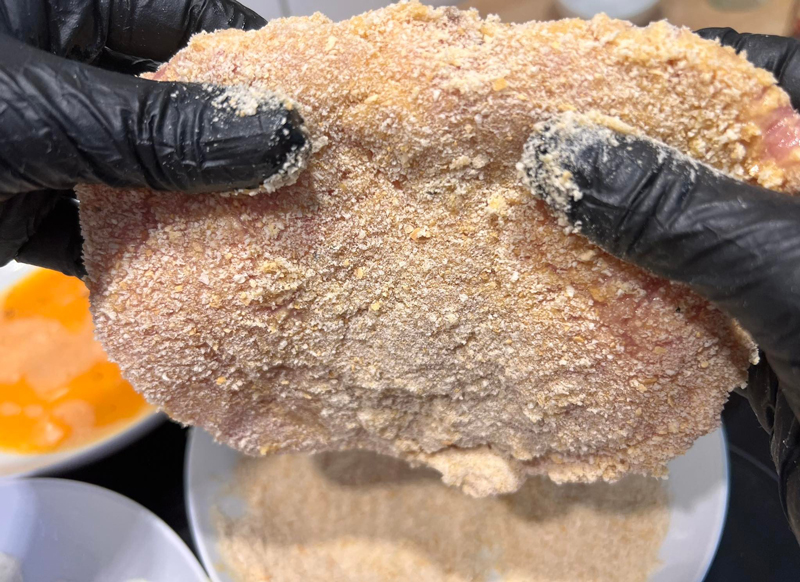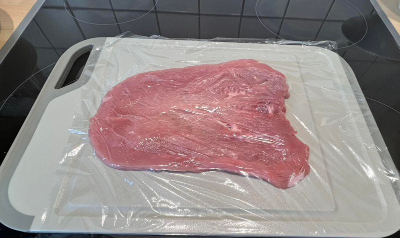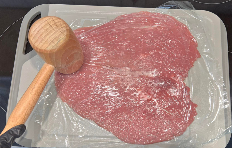Înainte să batem feliile de șnițel cu ciocanul pentru carne, adăugăm peste șnițele o pungă nouă de plastic. Carnea trebuie bătută cât mai subțire dar, atenție, să nu se rupă.