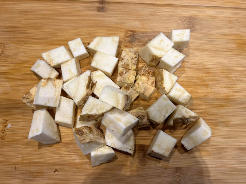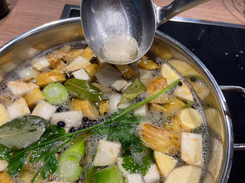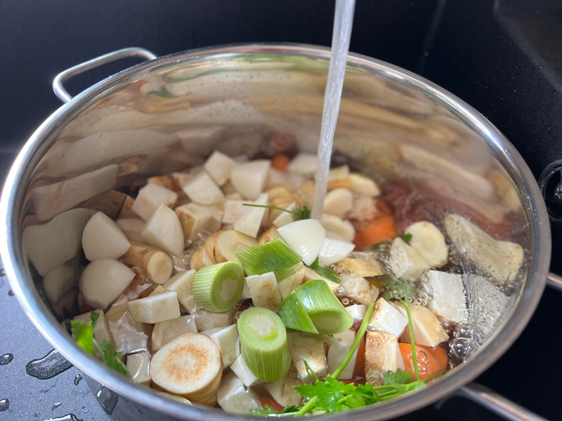 le curăț. După ce am tăiat legumele le punem într-o oală, turnăm apa și aducem oala la fierbere.
