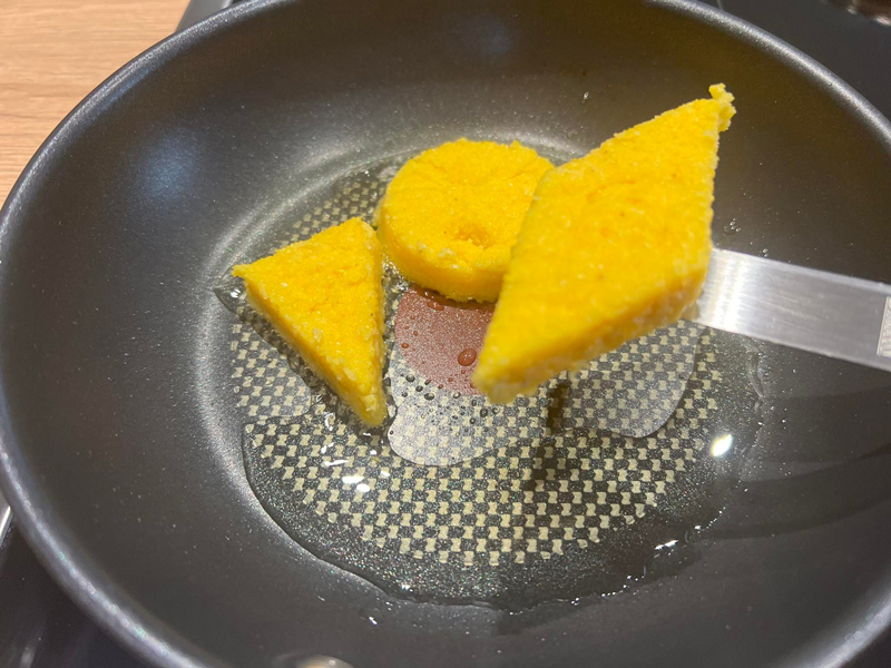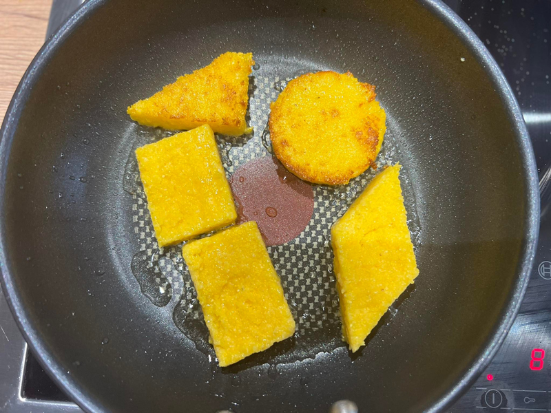 Adăugăm ulei în tigaie și prăjim bine mămăliga pe ambele părți. Se poate servi cu sos de roșii, gratinată cu parmezan sau brânză, sau carne de porc, pui. Depinde de gustul fiecăruia. Spor la gătit și nu uitați să gătiți cu pasiune!