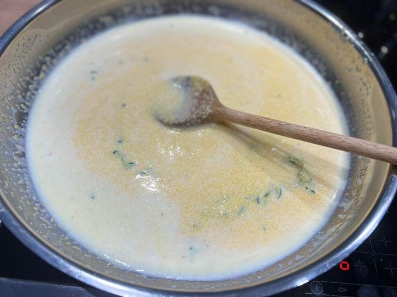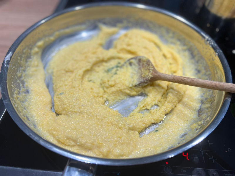 începe să fiarbă puțin, adăugăm untul si amestecăm adăugând apoi mălaiul, amestecând continuu.