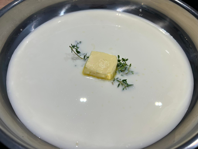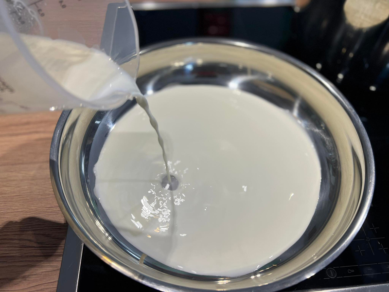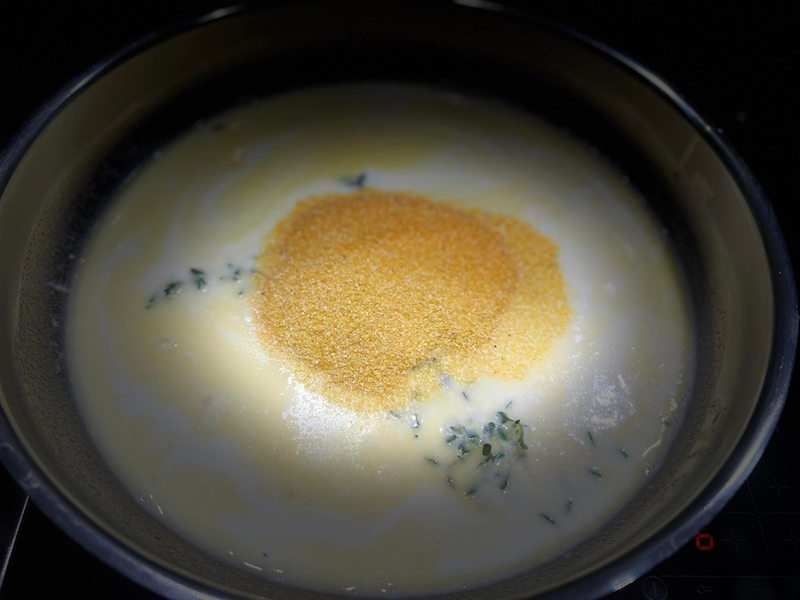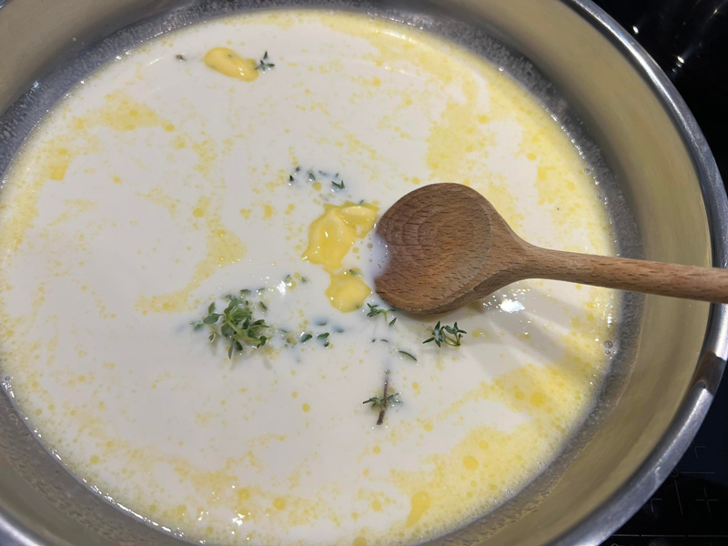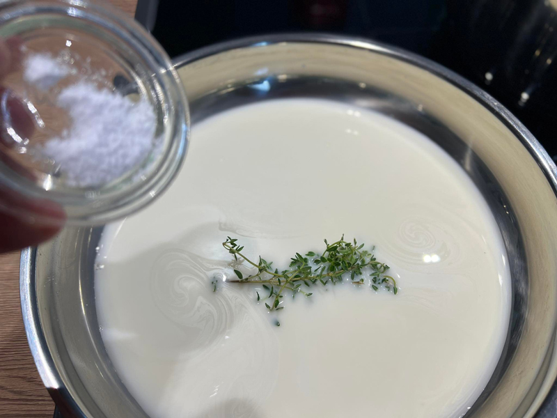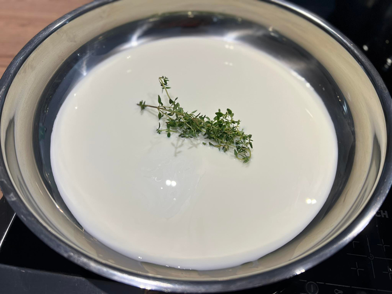 Adăugăm într-o tigaie sau oală, supa clară de legume, laptele, crenguța de cimbru sau