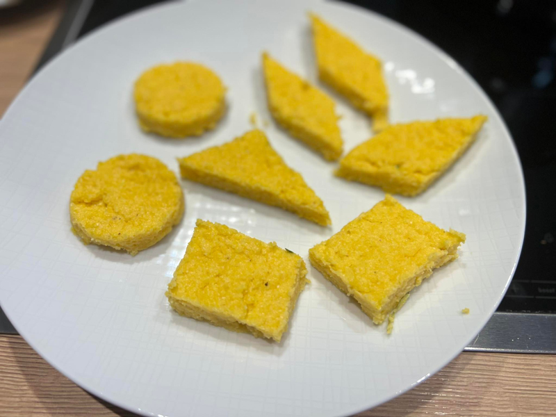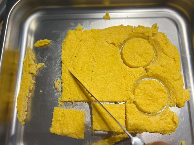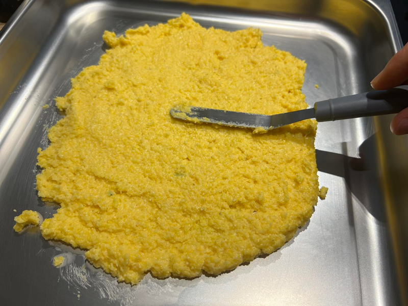 făina de mălai, deci, 6-8 minute a fost în cazul meu. Luam mămăliga de pe foc si o întindem uniform pe o tavă de grosimea a 3 cm, apoi o lăsăm să se răcească.