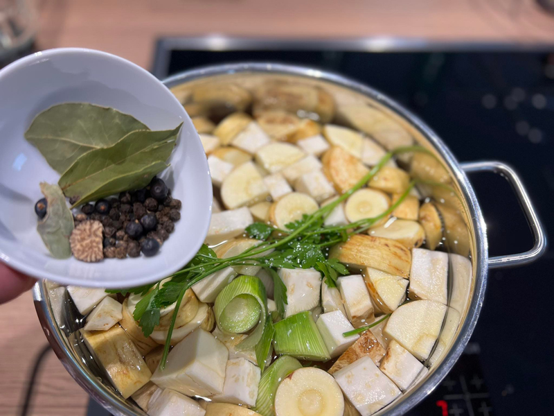 Adăugăm foile de dafin, piperul, nucșoara, sare, boabele de ienupăr și fierbem totul, pentru