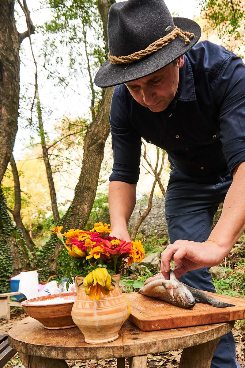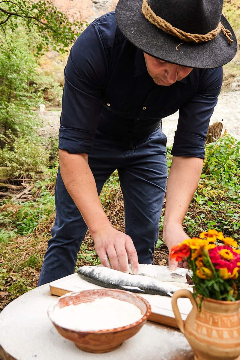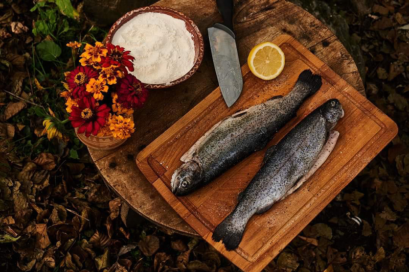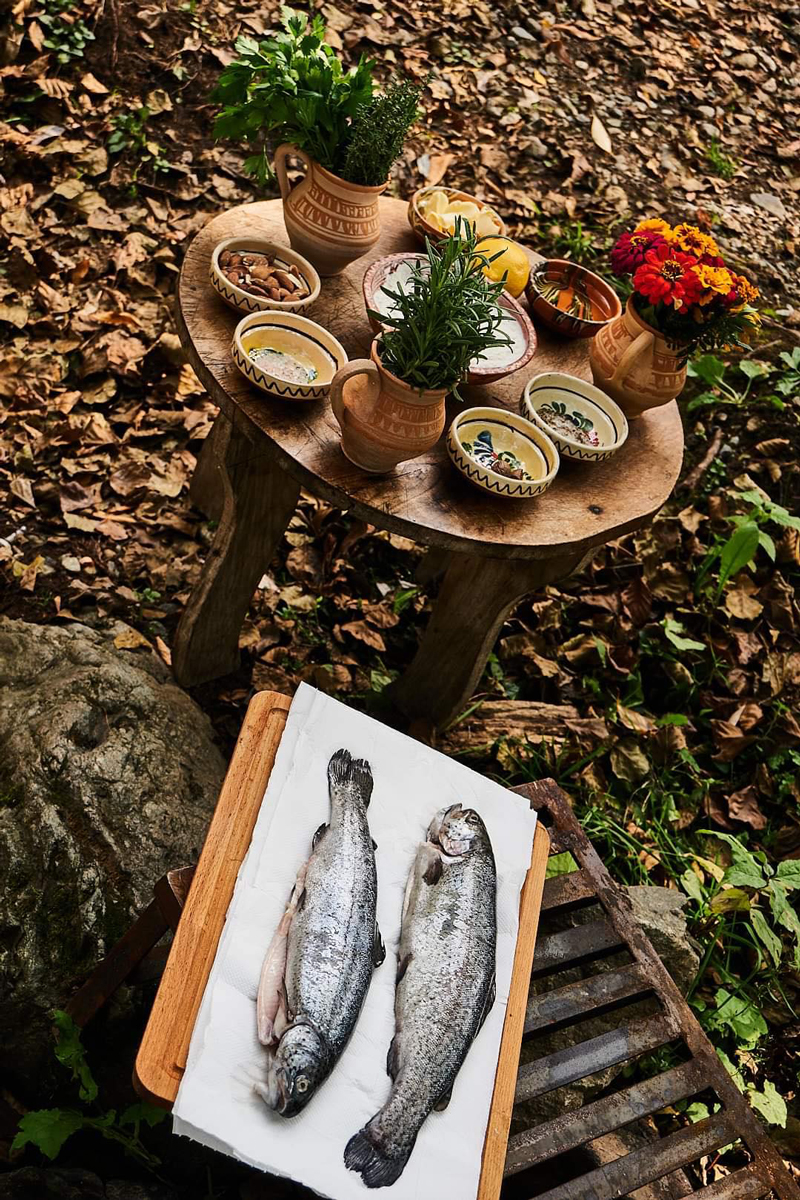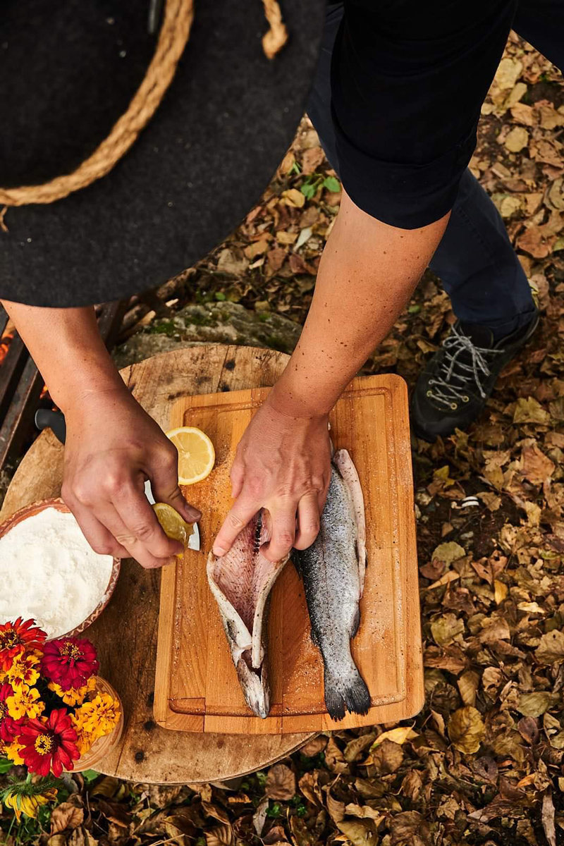Așadar, facem focul, curățăm păstrăvul, îl spălăm apoi îl ștergem cu un prosop absorbant de bucătărie și îl lăsăm puțin să se odihnească.