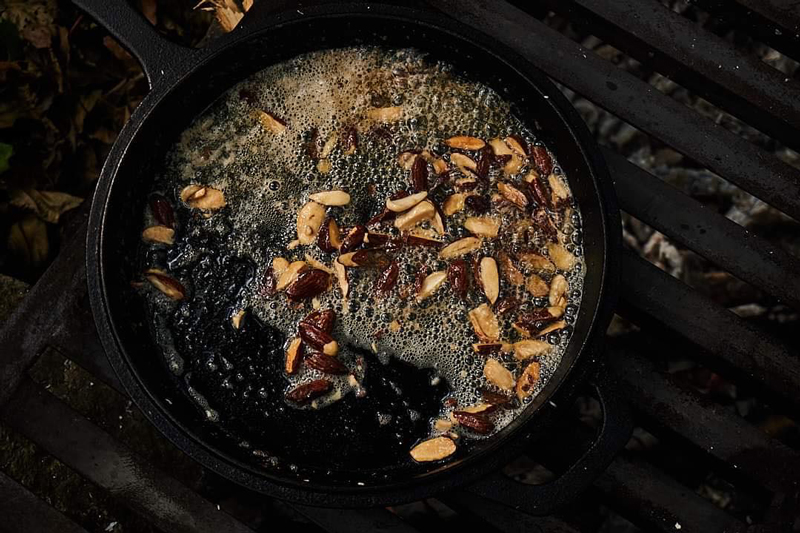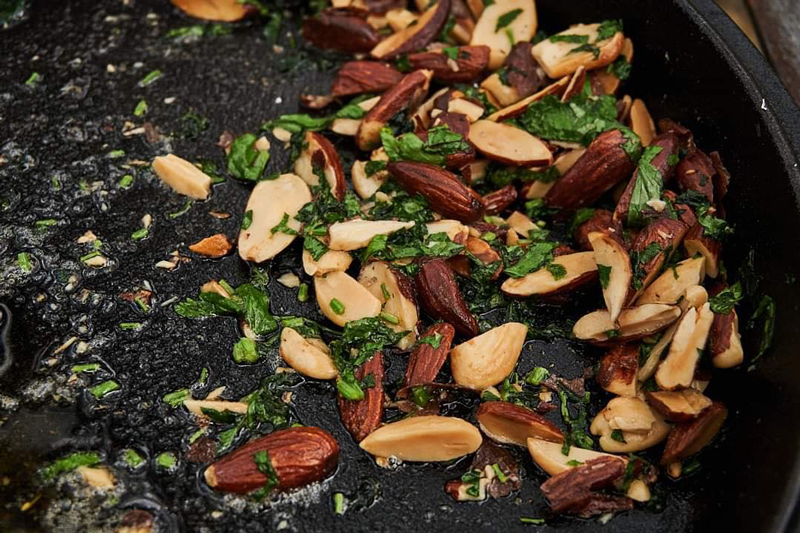 Le punem într-o tigaie și le prăjim scurt până ce au prins puțină culoare. Adăugăm untul peste acestea și îl lăsăm să se topească, numai bine, avem timp să tocăm mărunt pătrunjelul. După ce am tocat mărunt pătrunjelul iar untul s-a încorporat bine în migdale, dăm tigaia la o parte, adăugăm pătrunjelul verde tocat mărunt și amestecăm.