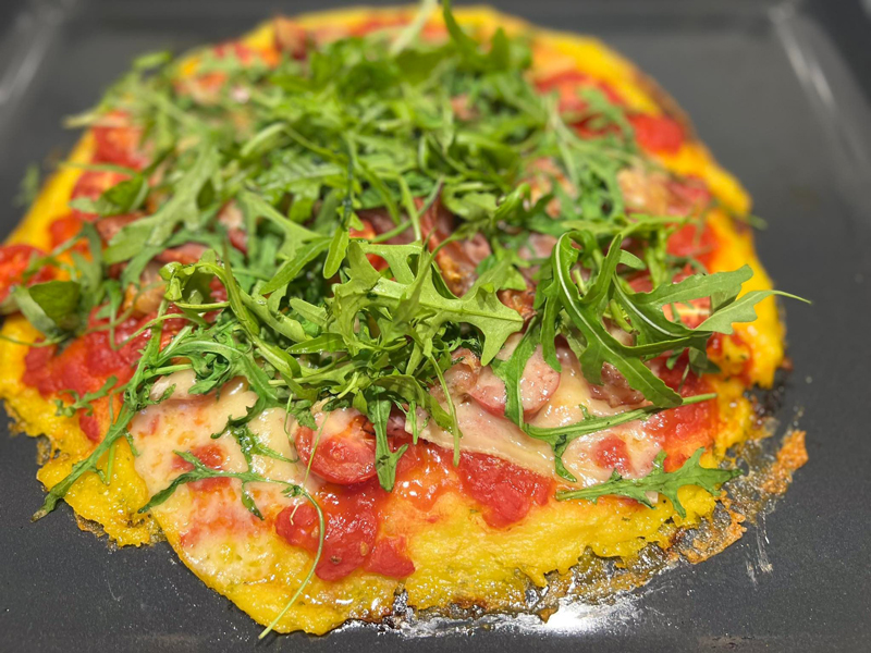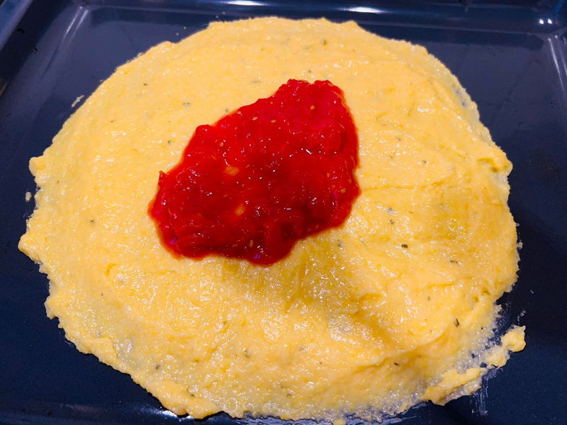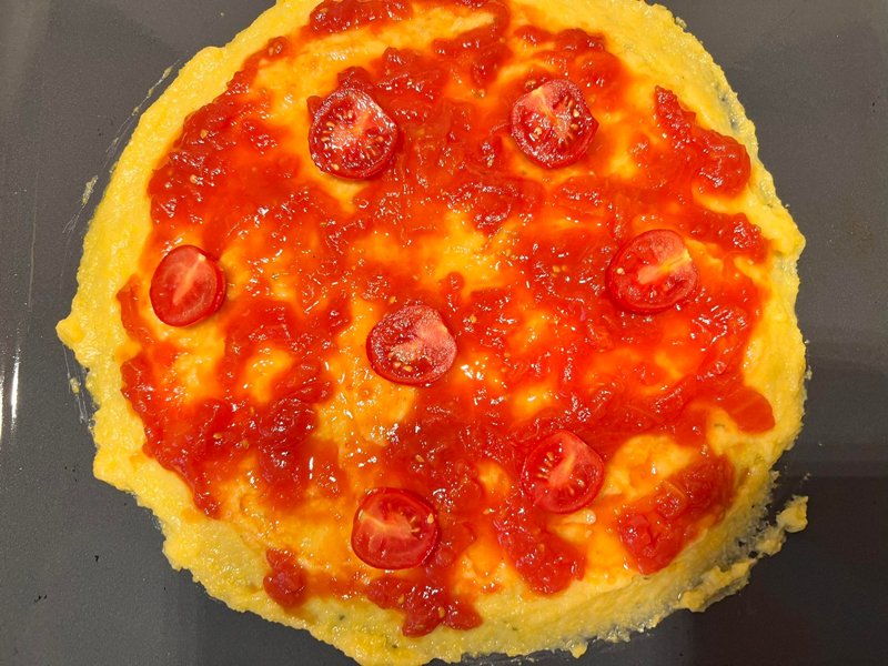 forma rotundă. Lăsăm puțin mămăliga să se răcească. Adăugăm sosul de roșii peste pizza