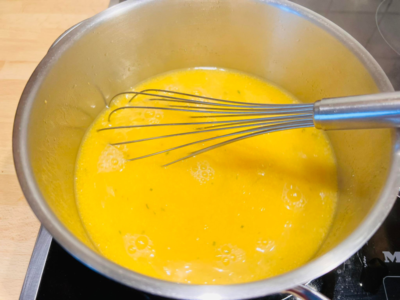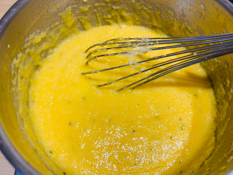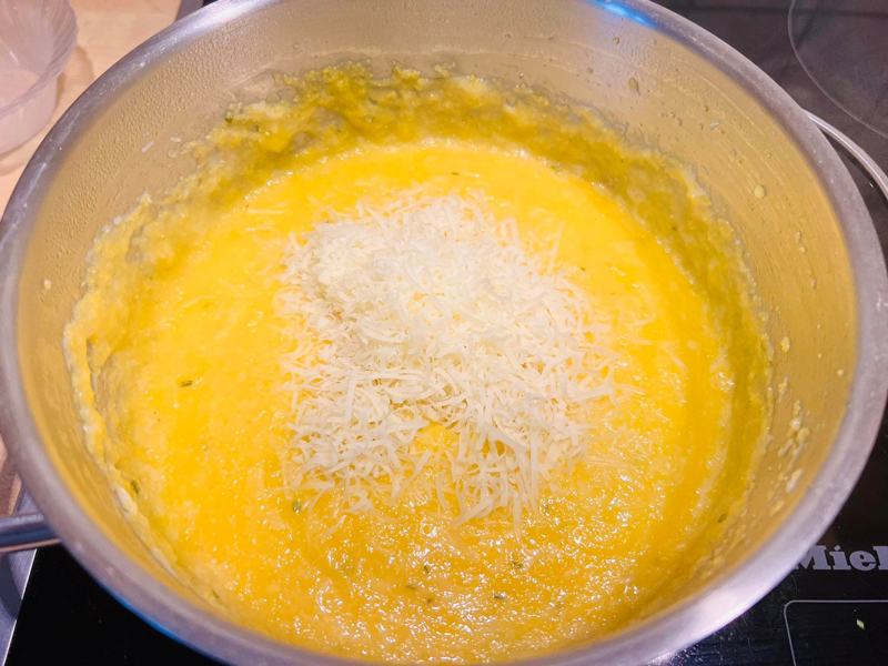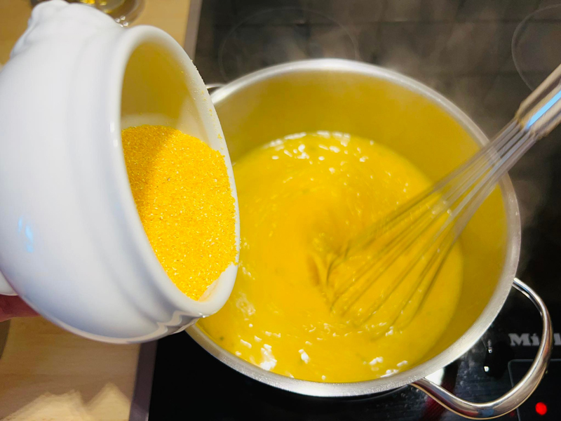Când apa dă în clocot, reducem temperatura și, treptat, adăugăm făina de mălai, amestecând continuu. După 5 minute, când mămăliga s-a legat, adăugăm parmezanul ras.