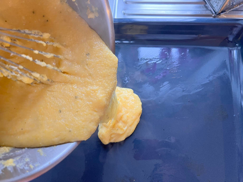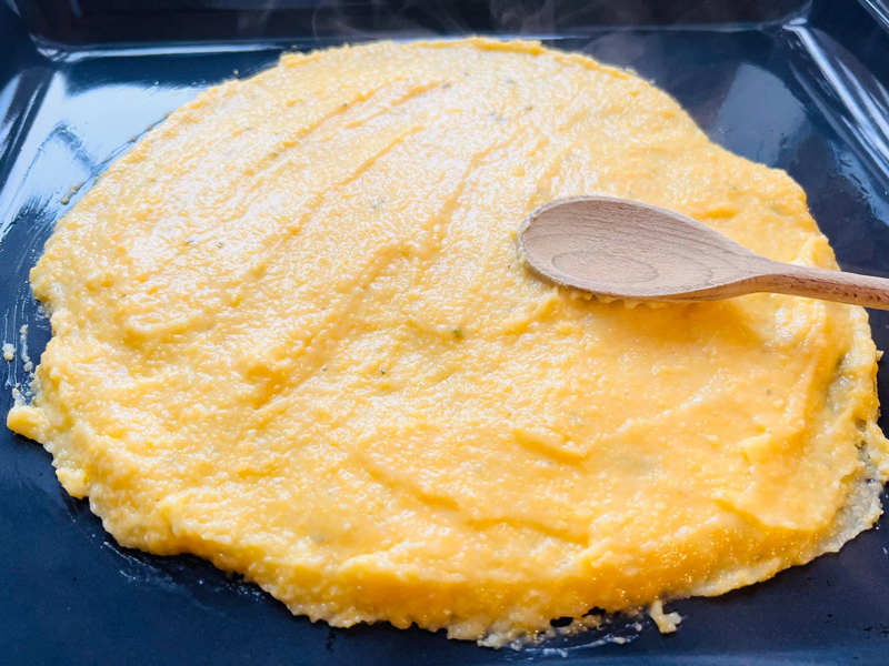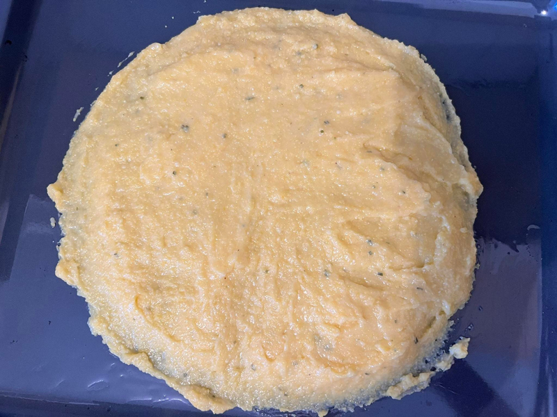 Turnăm mămăliga în tava pe care ulterior am uns-o cu ulei. Cu o lingură de lemn modelăm