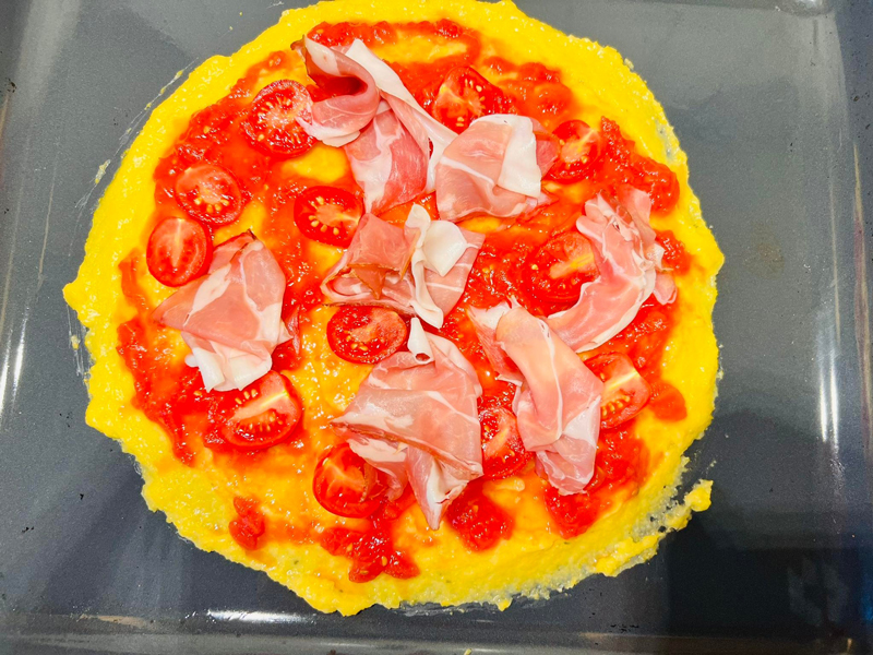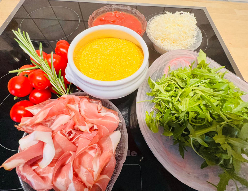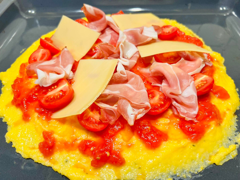 de mămăligă, apoi tăiem pe jumătate roșiile cherry, adăugăm șunca și cașcavalul feliat și