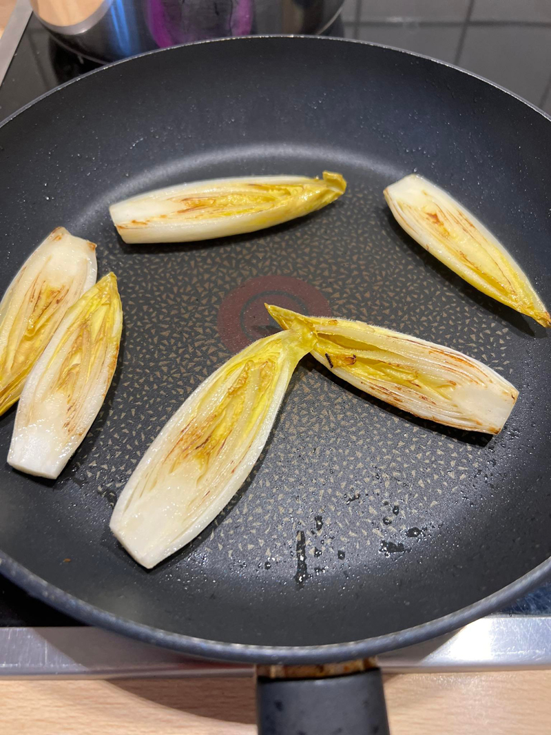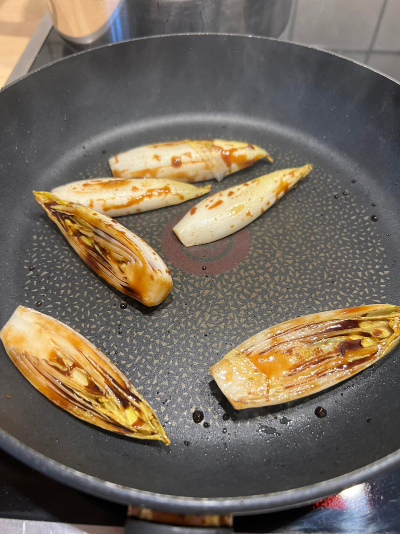 Prăjim andivele de culoarea aurie apoi le stingem cu oțet balsamic, le mai lăsăm 2 minute