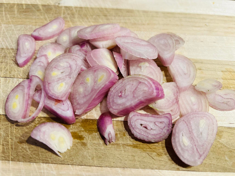 Curățăm ceapa de apă apoi o tăiem felii subțiri.