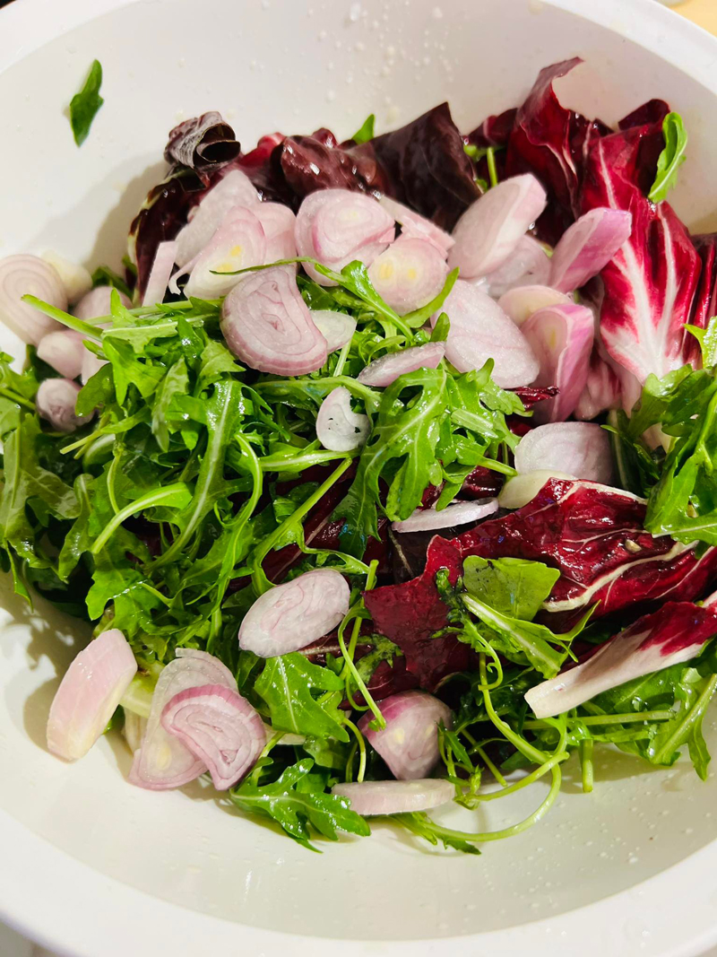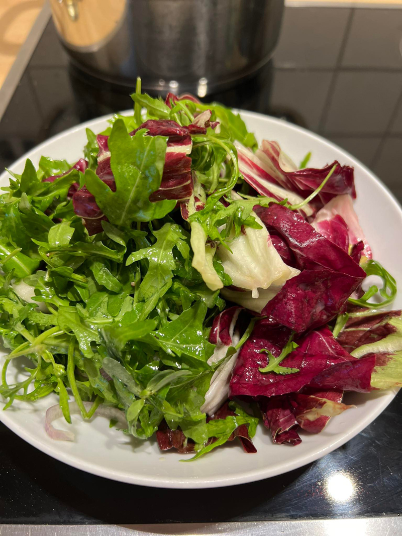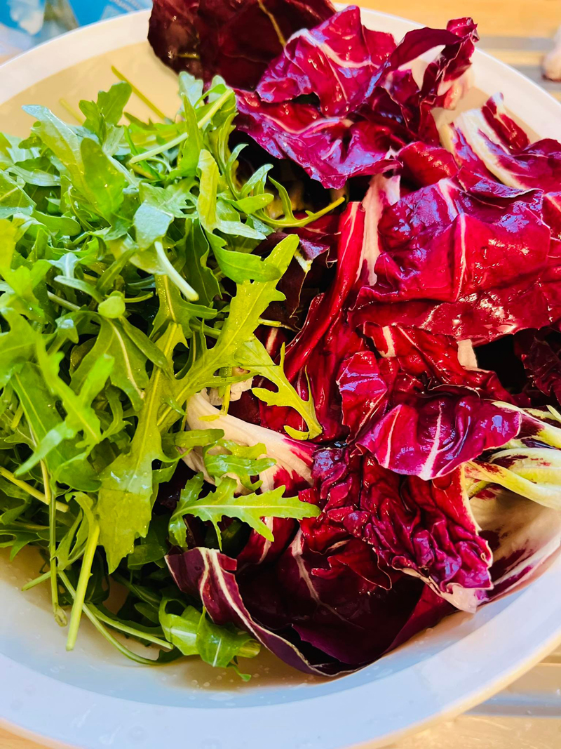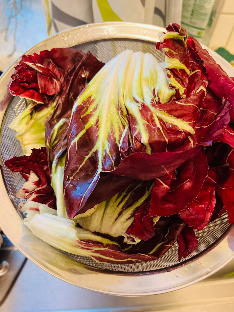 radiccio îndepărtăm primele frunze după care pe celelalte le desfacem pe rând și le rupem cu mâna în bucăți mari.