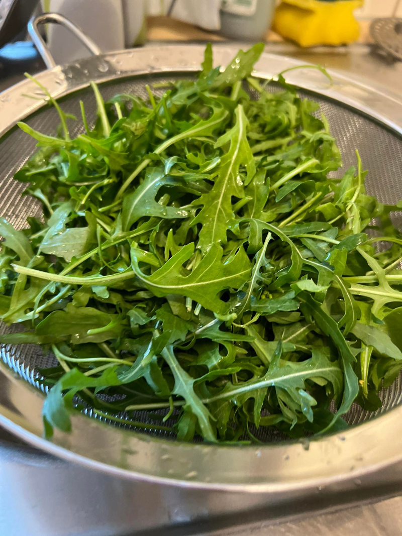 rucola o spălăm, apoi o punem pe un prosop de bucătărie să absoarbă apa. La salata