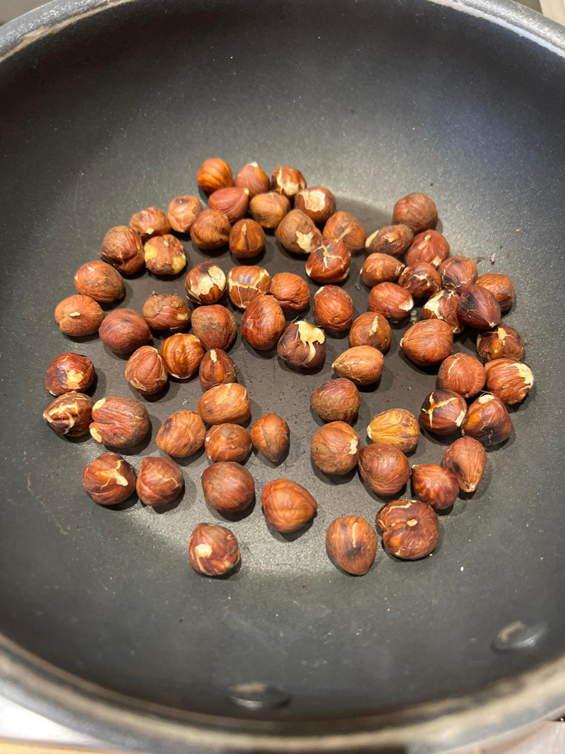 Într-o tigaie, adăugăm alunele de pădure pe care le prăjim puțin.