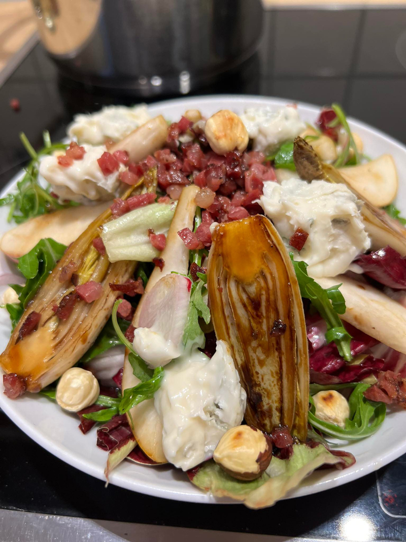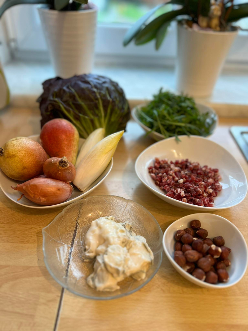 În ordine, de jur împrejur, adăugăm perele, bucăți rupte cu lingurița din brânza gorgonzola, șunca afumată, alunele, andivele.