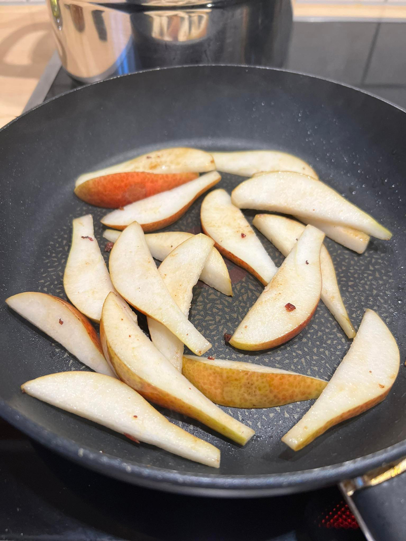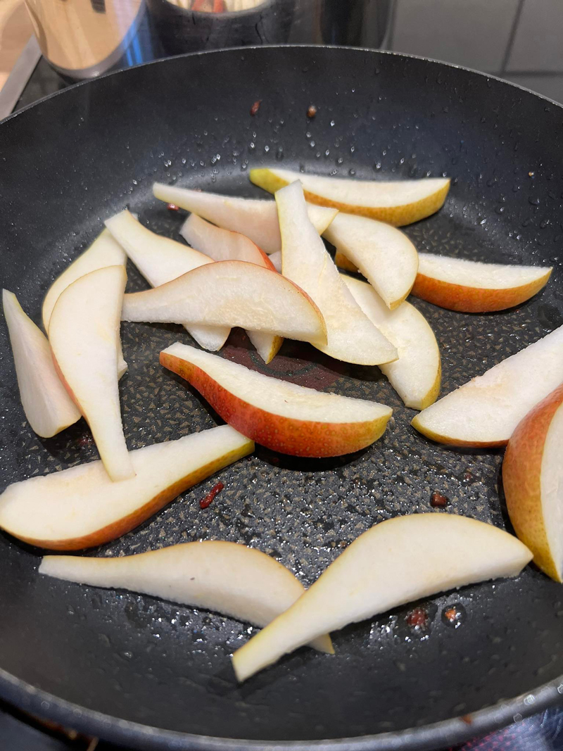 Prăjim perele în tigaia în care am prăjit șunca și, în acest fel, obținem gustul de afumătură care, în combinație cu perele, este senzațional.