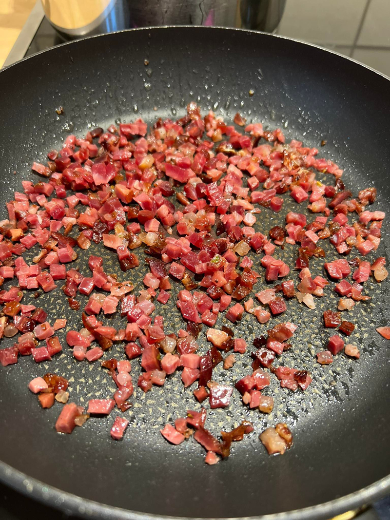 Aceeași tehnică o folosim cu șunca afumată, eu am cumpărat șuncă gata tocată după tehnica brunnoise, adică cubulețe foarte mici.