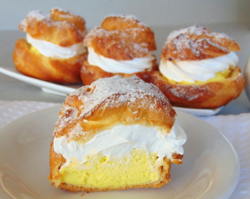 Apa se pune la fiert cu sarea și uleiul, iar după ce clocotește se ia imediat de pe foc. Se adaugă făina dintr-o dată și se amestecă până la omogenizare. Se lasă puțin să se răcească. Ouăle se adaugă în aluat unul câte unul, după care se amestecă bine cu mixerul. Nu se adaugă următorul ou până ce primul nu este bine înglobat. Aluatul trebuie să strălucească și să aibă un contur ferm. Fiind foarte moale, trebuie șprițat. Se pun în tava tapetată cu hârtie de copt. Se introduc gogoșelele în cuptorul încins, mai întâi la foc iute, apoi la foc mediu, 20 minute la 200 de grade. Se scot din cuptor, se lasă la răcit și se taie un capac. Gălbenușurile, împreună cu 50 gr zahăr, 3-4 linguri de lapte și făina se omogenizează bine. Se adaugă treptat 250 ml lapte rece. Se pune la bain-marie. Se amestecă cu un tel până începe să se îngroașe, apoi se adaugă și restul de lapte fierbinte și untul. Se bate în continuare cu telul până când compoziția e perfect omogenă. Se adaugă la final zahărul vanilinat și albușurile bătute spumă cu 100 gr de zahăr.Se umplu gogoșelele cu cremă și frișcă. Deasupra se așază capacul și se pot orna cu zahăr pudră sau ciocolată.