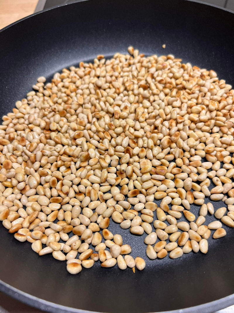 Între timp, într-o tigaie fără ulei prăjim mugurii de pin de culoarea aurie. Dăm parmezanul pe răzătoarea fină.