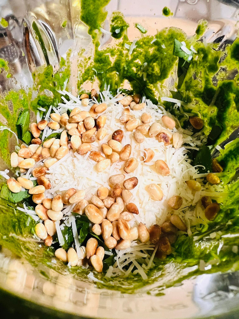 Într-un robot de bucătărie, adăugăm uleiul de măsline, leurda, mugurii de pin, parmezanul și sare după gust.