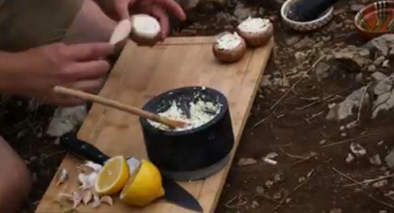 Umpleţi ciupercile cu o lingură. Împărţiţi puţin ulei pe placa de granit cu o pensulă.