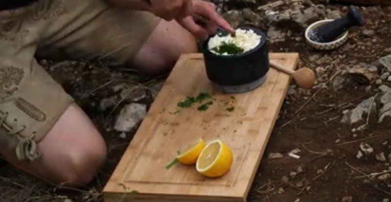 Într-un mojar, adăugaţi brânza, pătrunjel, usturoi, sare, piper, puţin suc de lămâie şi amestecaţi totul împreună.