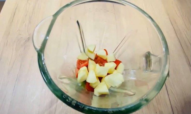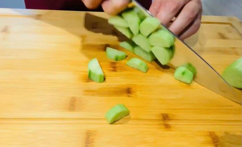 Mărul, castravetele se curăță de coajă. Tăiați legumele cubulețe de aproximativ 2-3 cm sau după placul fiecăruia.