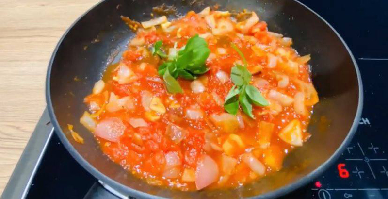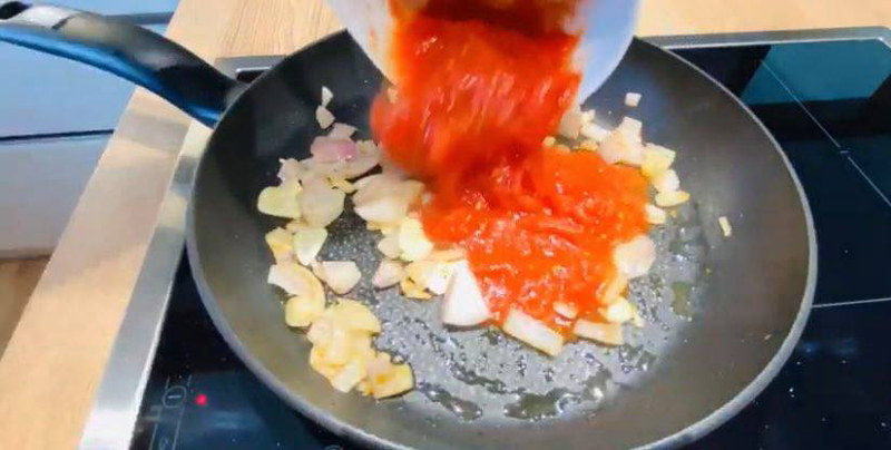 Adăugați ceapa şalotă şi prăjiţi până devine aurie; adăugați usturoiul şi prăjiţi încă 2 minute, apoi adăugați sosul de roşii.