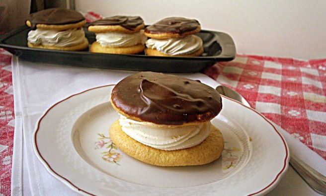 •Jumătate din coji se însiropează și se pun pe un platou. Pe fiecare pui apoi crema. Acoperi cu celelalte coji rămase.